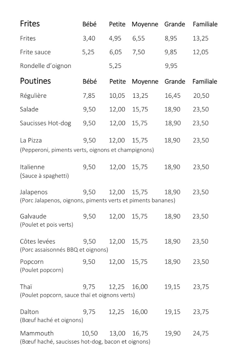 The menu at Le Mammouth leaves a lasting impression with its generous portions, comforting flavors, and a clear focus on indulgent classics done right. The poutine selection stands out in particular, with favorites like Poutines Côtes Levées and Poutines Popcorn offering rich, satisfying combinations that feel both hearty and creative. For those looking for a smaller but still satisfying option, the Mini Mammouth & 1 Small Fries is a well-balanced choice that captures the restaurant’s signature flavors in a more compact portion. Meanwhile, the Burger Mammouth delivers exactly what its name promises-a big, flavorful burger that feels like a centerpiece item on the menu. Overall, the menu feels cohesive and comfort-driven, with dishes that prioritize flavor, portion size, and a fun, casual dining experience, making it a place that’s easy to recommend for anyone craving classic Quebec-style comfort food.